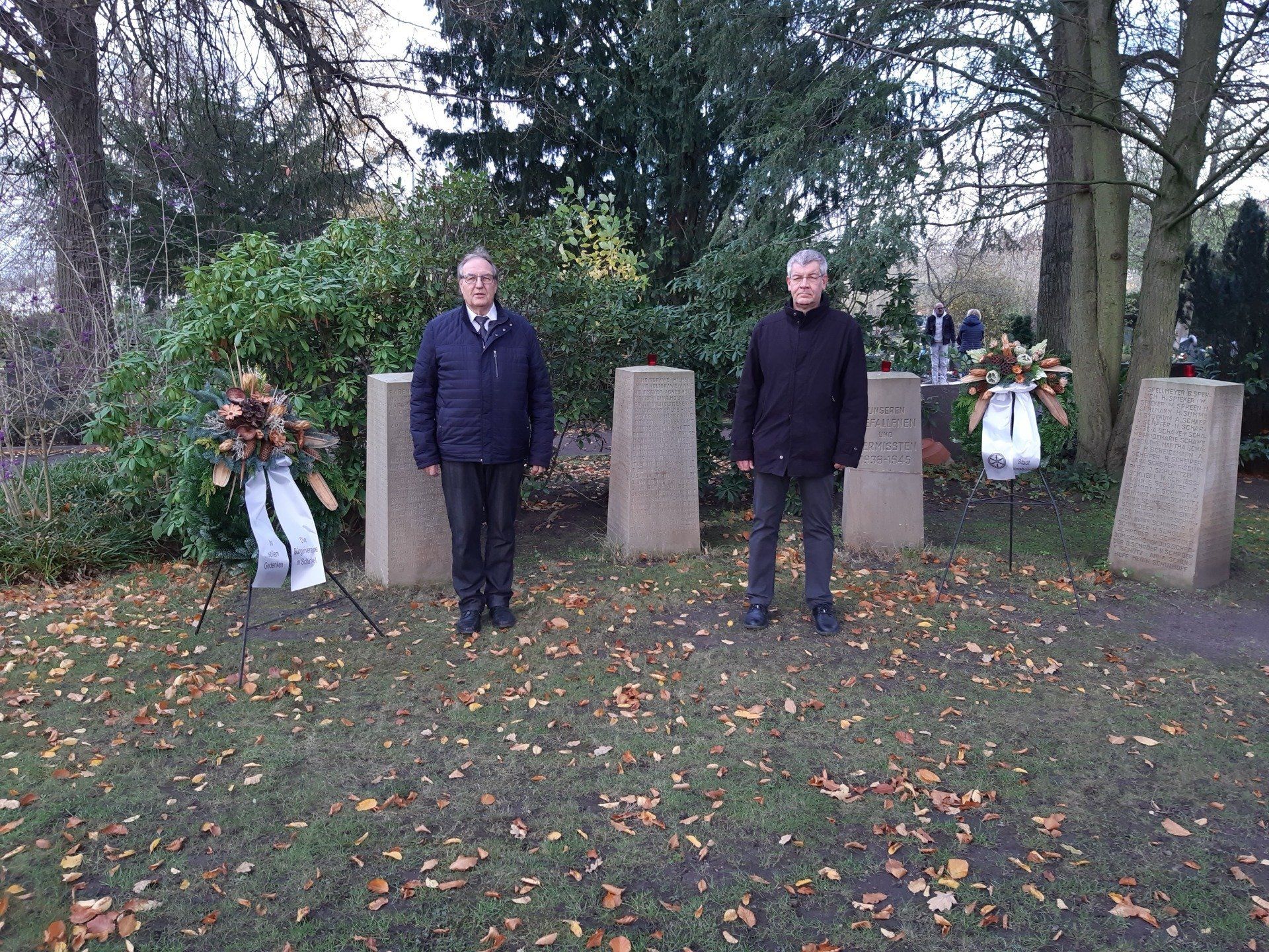 Am Volkstrauertag haben die Vorsitzenden der Schinkeler Bürgervereine, Walter Leineweber und Carsten Friderici, am Ehrenmal und Gräberfeld auf den Schinkeler Friedhof Kränze niedergelegt und Kerzen entzündet. Frau Silke Nagel hat das stille Gedenken mit zwei Musikstücken auf ihrer Trompete weithin hörbar begleitet.