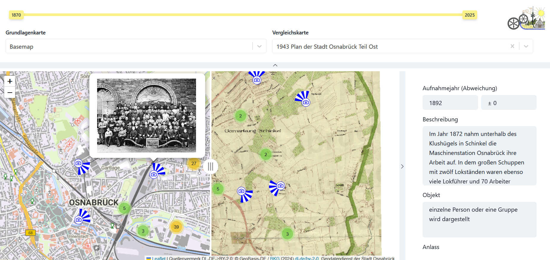 Unser Webtool stellt Archivdaten, d.h. Bildern, Videos und Schriftdokumenten im räumlichen und zeitlichen Kontext als Internetanwendung da.